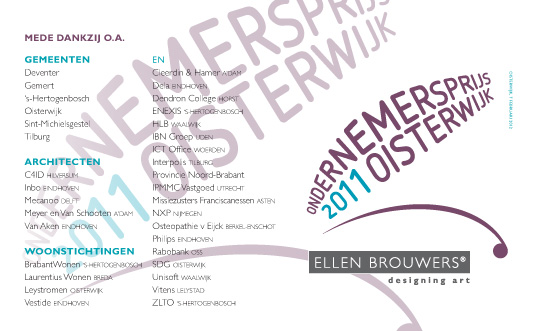 Dit zijn meestal architectenbureaus, wooncorporaties, gemeenten en bedrijven. Ik ben trots op wat ik onafhankelijk en op eigen kracht tot nu toe heb bereikt. Mijn inspiratie kwam van o.a. van: mijn ouders die me leerden nooit op te geven, mijn broer die me altijd zakelijk ondersteunde, de bedrijven die me technisch hebben geholpen bij de vele ingewikkelde projecten technisch uit te voeren, de mensen om mij heen, de kritische meedenkers, researchers en vakgenoten, mijn vele buitenlandse kunstreizen en de wandeltochten door het Brabantse land.