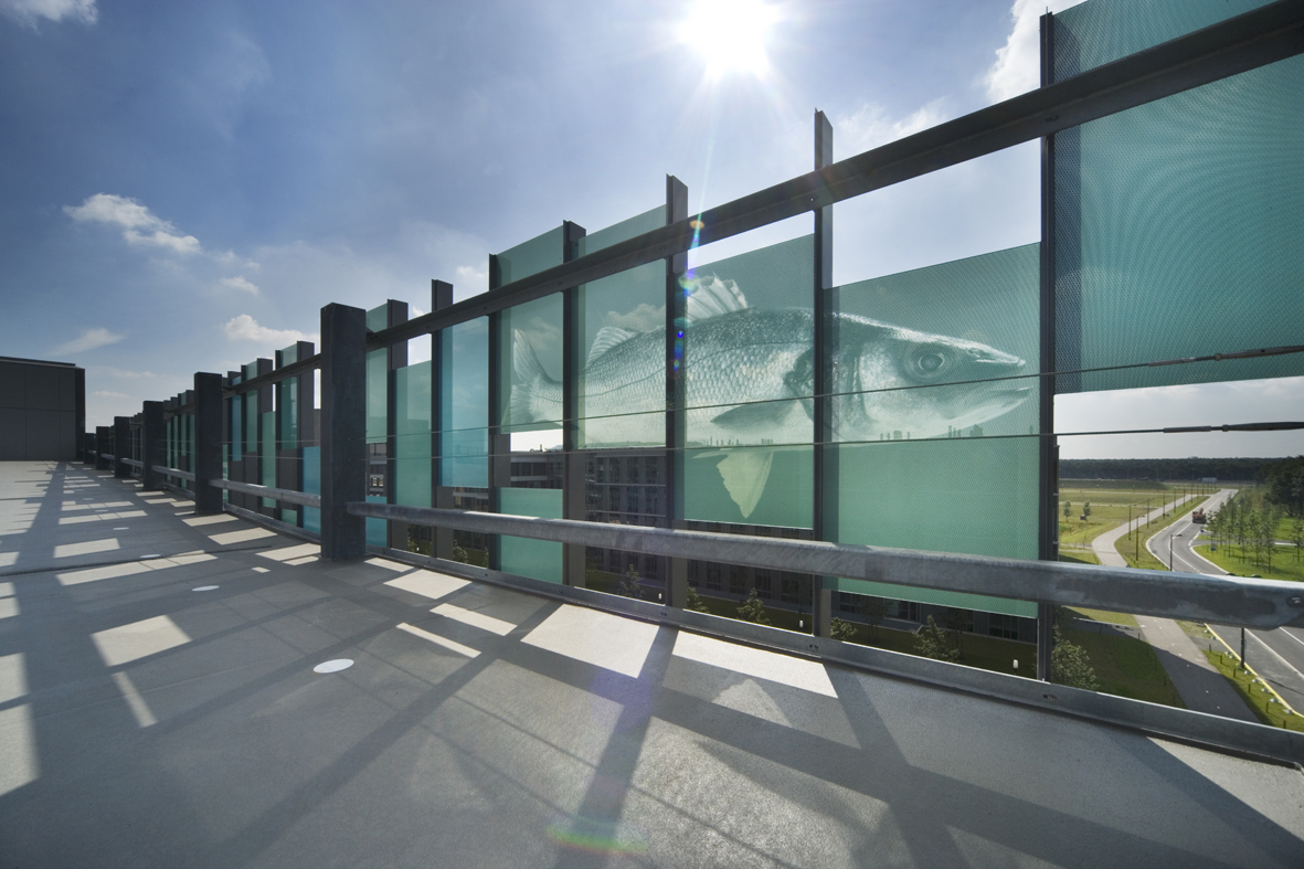 Als vissen in een groot aquarium zijn auto’s in een parking, voortdurend in beweging, draaien rondjes, komen en gaan. Zo ook mensen en hun gedachten, steeds op zoek naar een vrije ruimte, om er even te verwijlen en dan weer verder te gaan. Dynamiek, in en om ons heen, is een tijdloos gegeven, een bron van creativiteit en verandering. Naar buiten toe wordt dat zichtbaar gemaakt door dit transparante beeld van vissen achter glas. Het toont ook de wederkerigheid van de blik: het is een kijken van binnen naar buiten en omgekeerd; het staat voor kijken naar en reflectie op, en is daarmee een bron van creativiteit en verandering. Een aquarium, vissen achter glas, wijst voorts op de constructie van onze omgeving. Het ontwerp symboliseert de dynamiek, de creativiteit en de constructie die eigen zijn aan onze omgeving. De transparantie van het ontwerp heft de kunstmatige beslotenheid op door ons open te stellen voor de beleving van de wisselingen van de seizoenen.