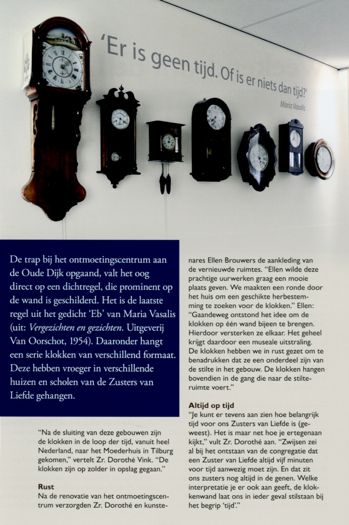 De klokkenwand laat de zusters stil staan bij het begrip ‘tijd’,We hebben de klokken in rust gezet om te benadrukken dat ze een onderdeel zijn van de stilte in het gebouw.