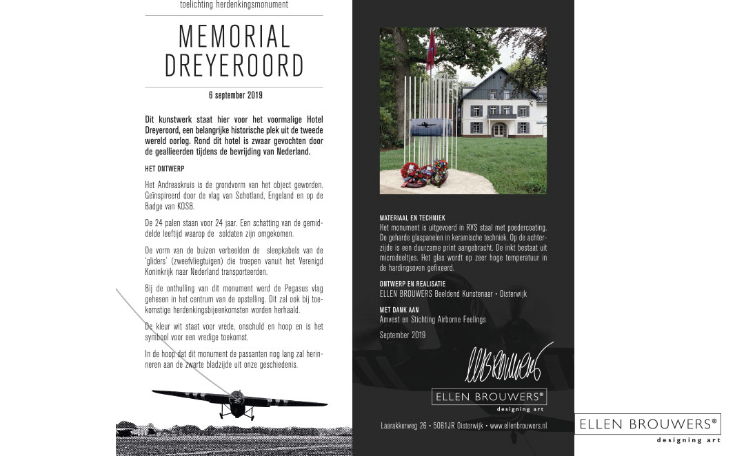 Dit kunstwerk staat voor het voormalige Hotel Dreyeroord, een belangrijke historische plek uit de tweede wereld oorlog. Rond dit hotel is zwaar gevochten door de geallieerden tijdens de bevrijding van nederland.