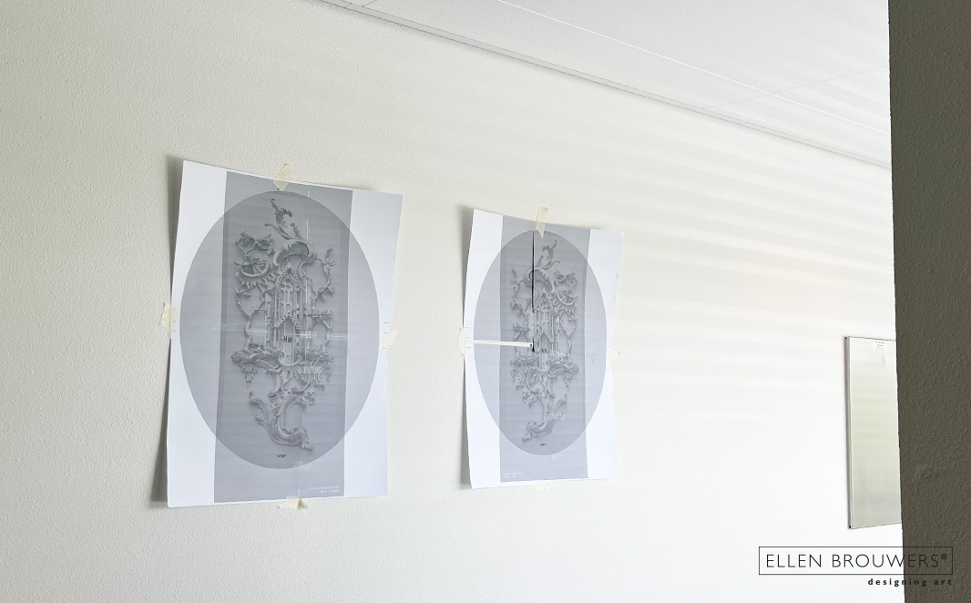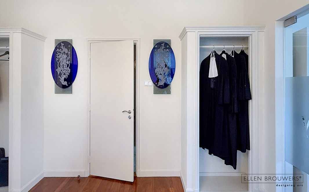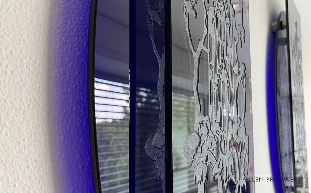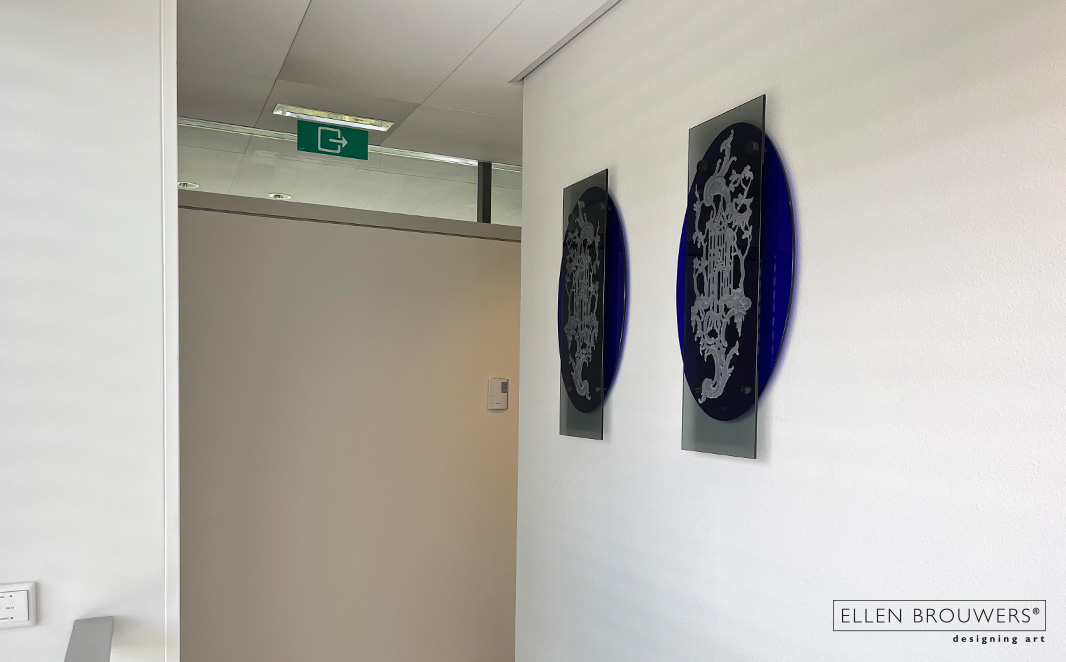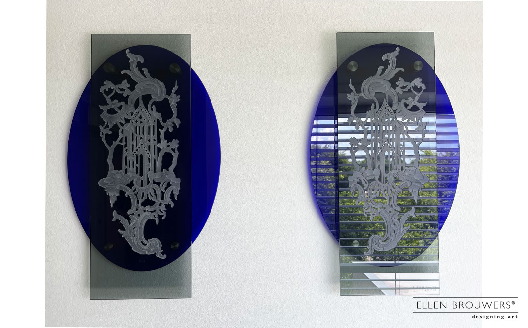Glas kobaltblauw en grijs, rvs ophangsysteem, diep straalwerk